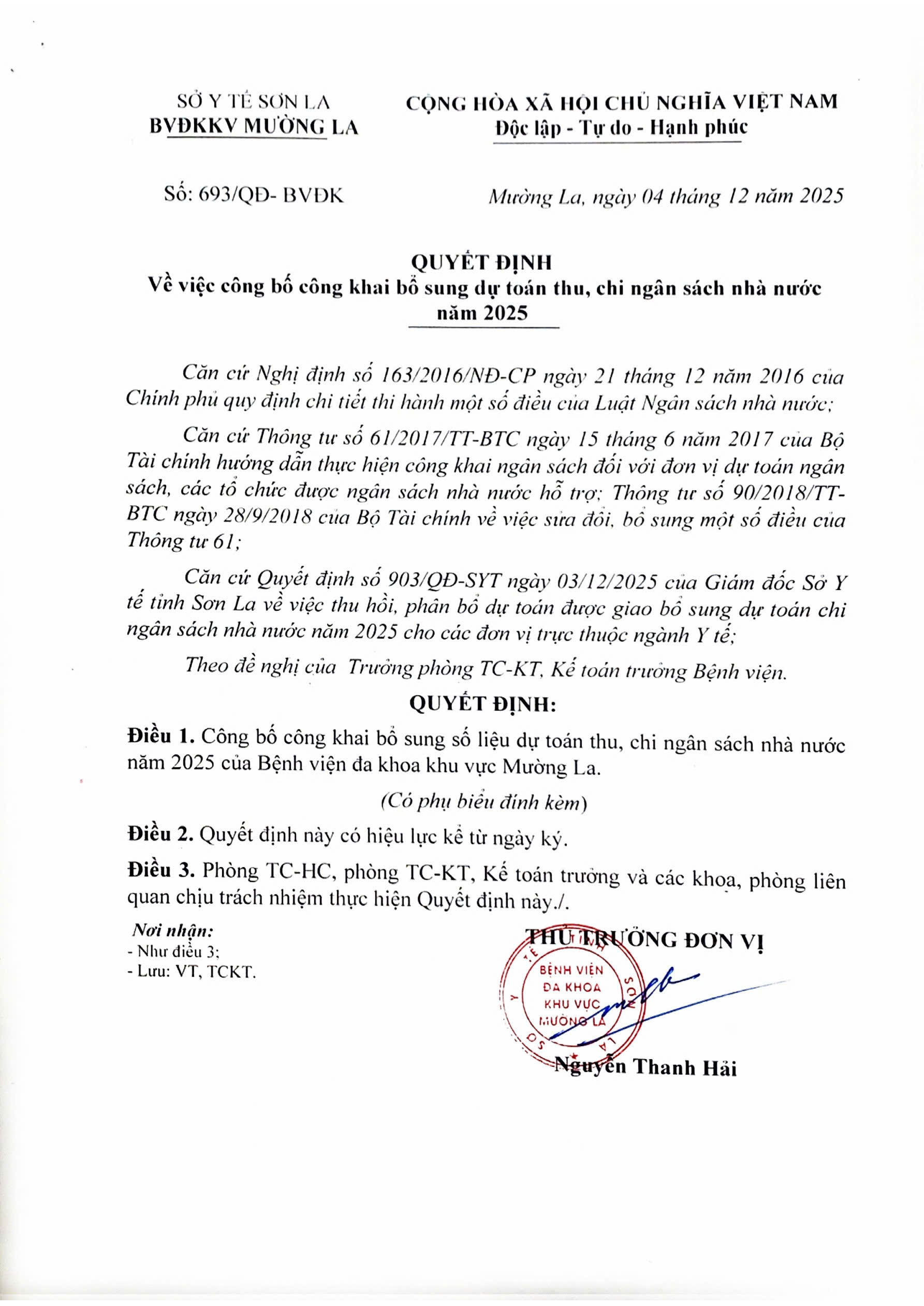 QUYẾT ĐỊNH SỐ 693/QĐ-BVĐK ngày 04/12/2025 của Bệnh viện đa khoa khu vực Mường La. Chi tiết QUYẾT ĐỊNH: