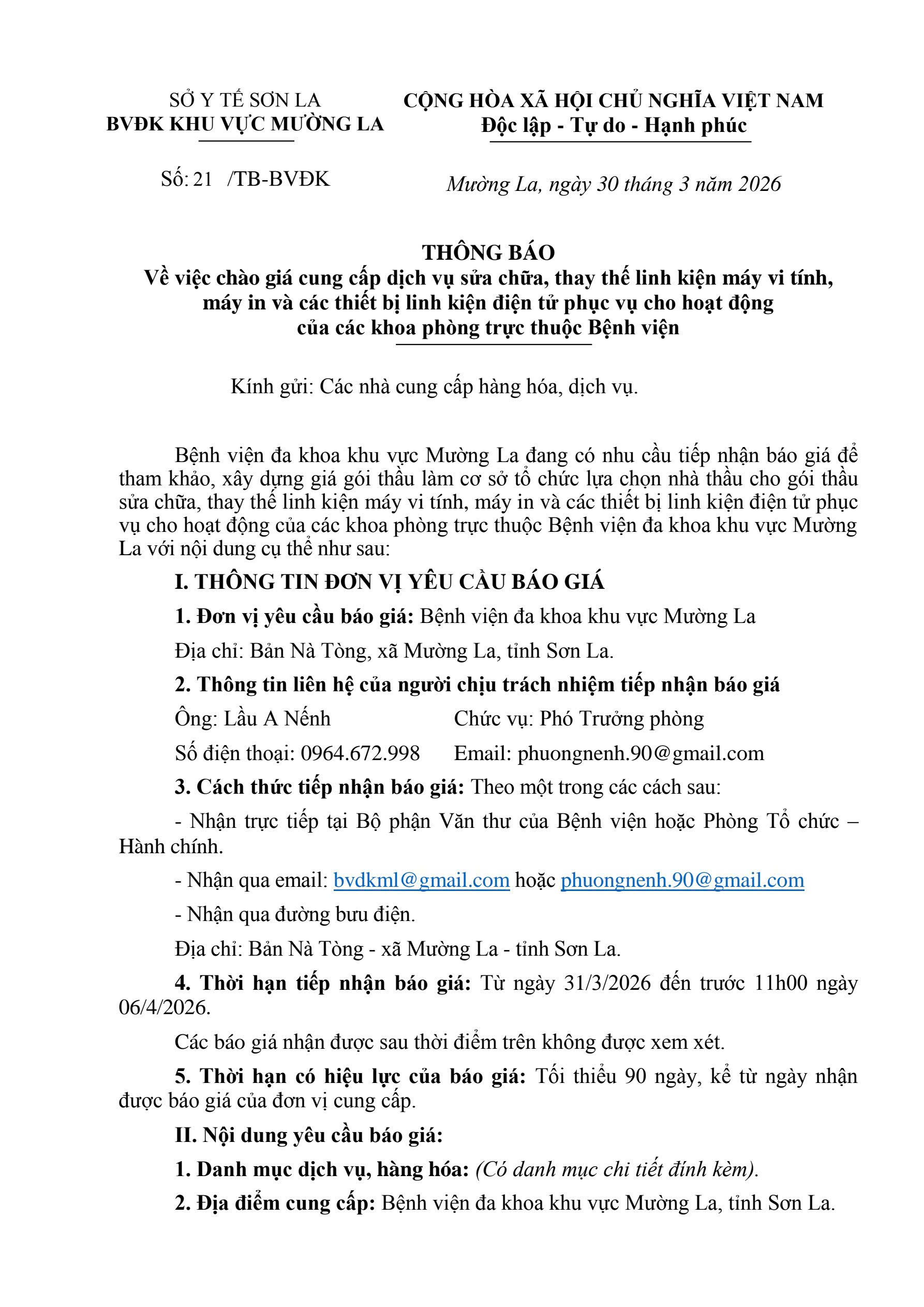 THÔNG BÁO CHÀO GIÁ CUNG CẤP VĂN PHÒNG PHẨM VÀ VẬT TƯ VĂN PHÒNG PHẨM PHỤC VỤ CHO HOẠT ĐỘNG CỦA BỆNH VIỆN ĐA KHOA KHU VỰC MƯỜNG LA