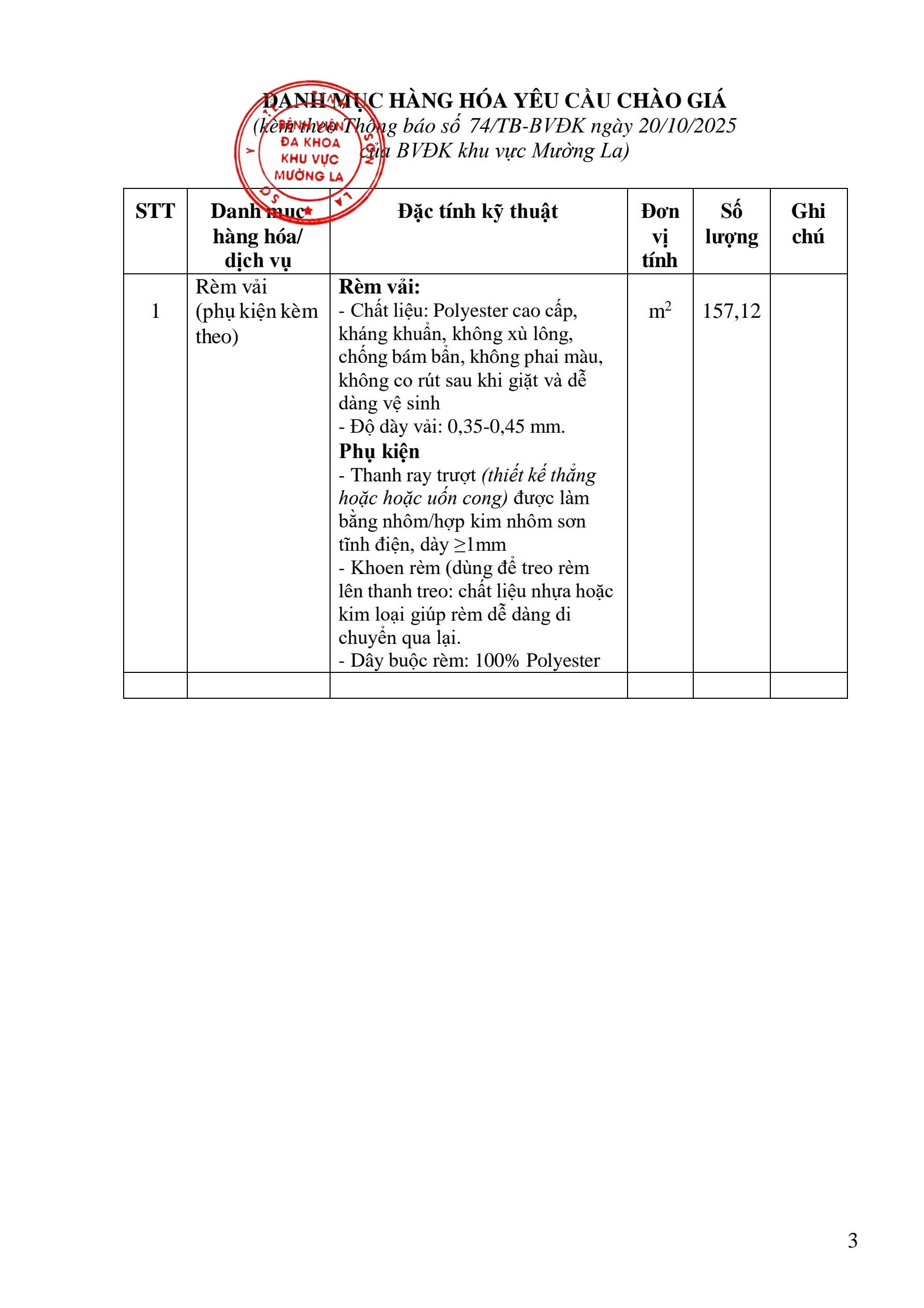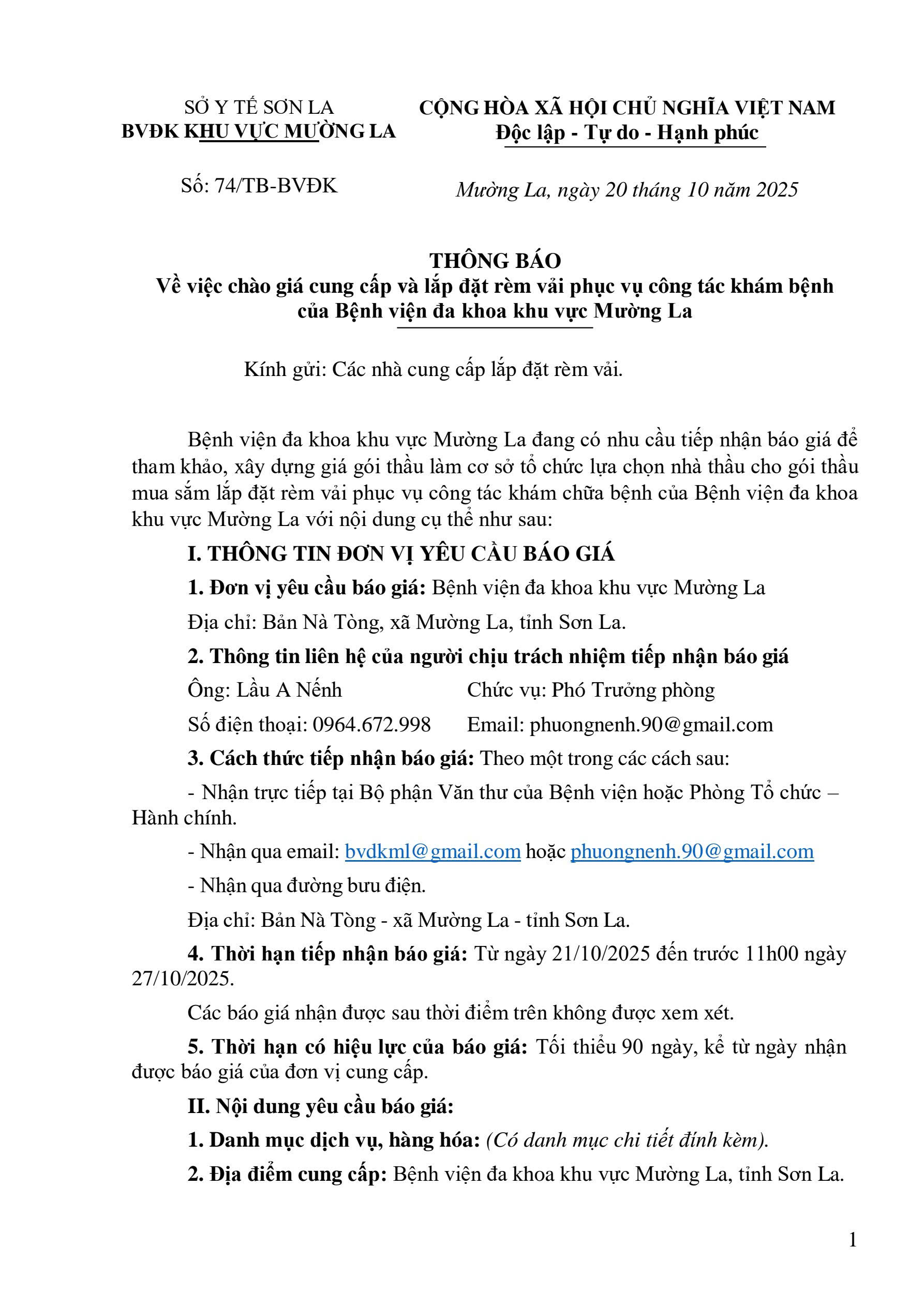 THÔNG BÁO VỀ VIỆC CHÀO GIÁ CUNG CẤP VÀ LẮP ĐẶT RÈM VẢI PHỤC VỤ CÔNG TÁC KHÁM CHỮA BỆNH CỦA BỆNH VIỆN ĐA KHOA KHU VỰC MƯỜNG LA