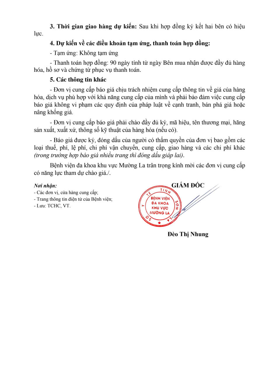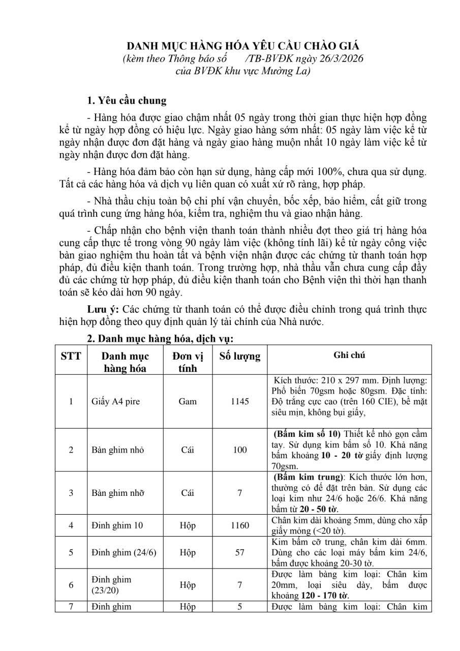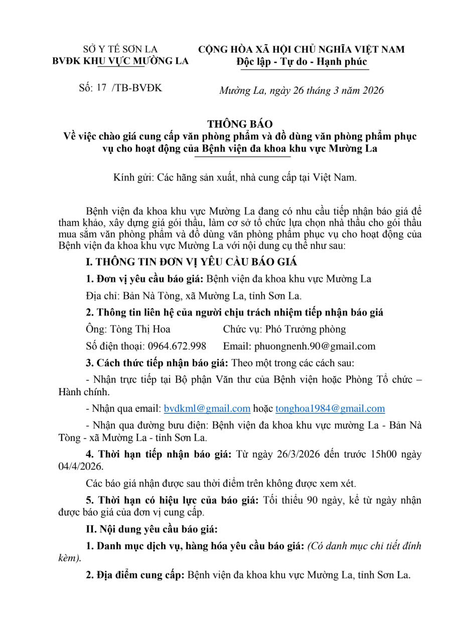 THÔNG BÁO CHÀO GIÁ CUNG CẤP VĂN PHÒNG PHẨM VÀ VẬT TƯ VĂN PHÒNG PHẨM PHỤC VỤ CHO HOẠT ĐỘNG CỦA BỆNH VIỆN ĐA KHOA KHU VỰC MƯỜNG LA