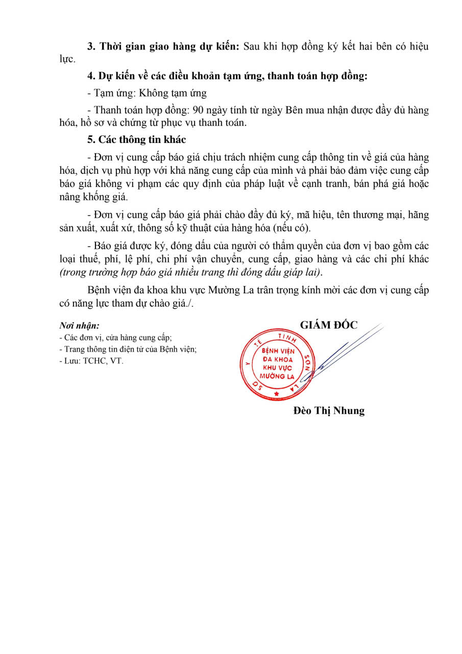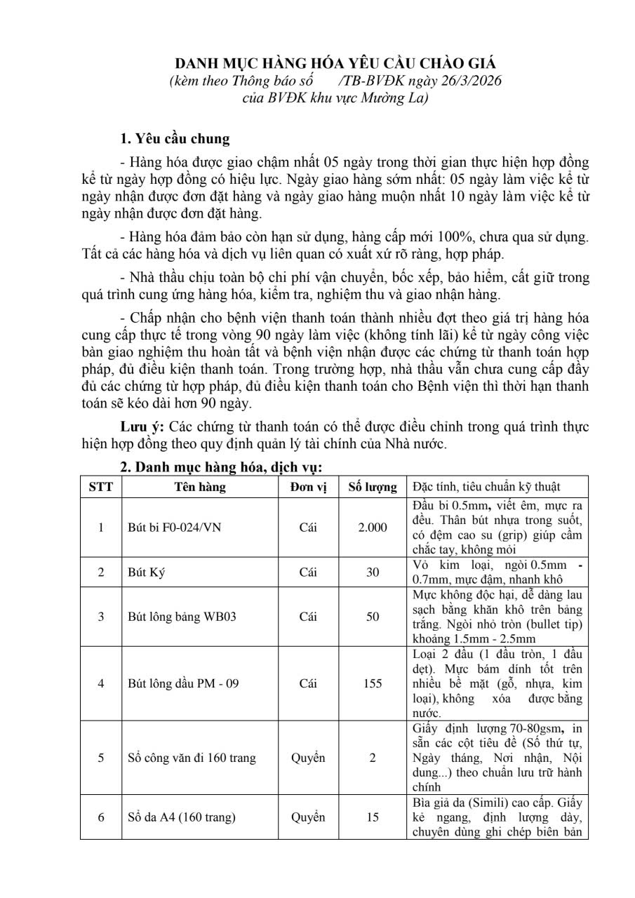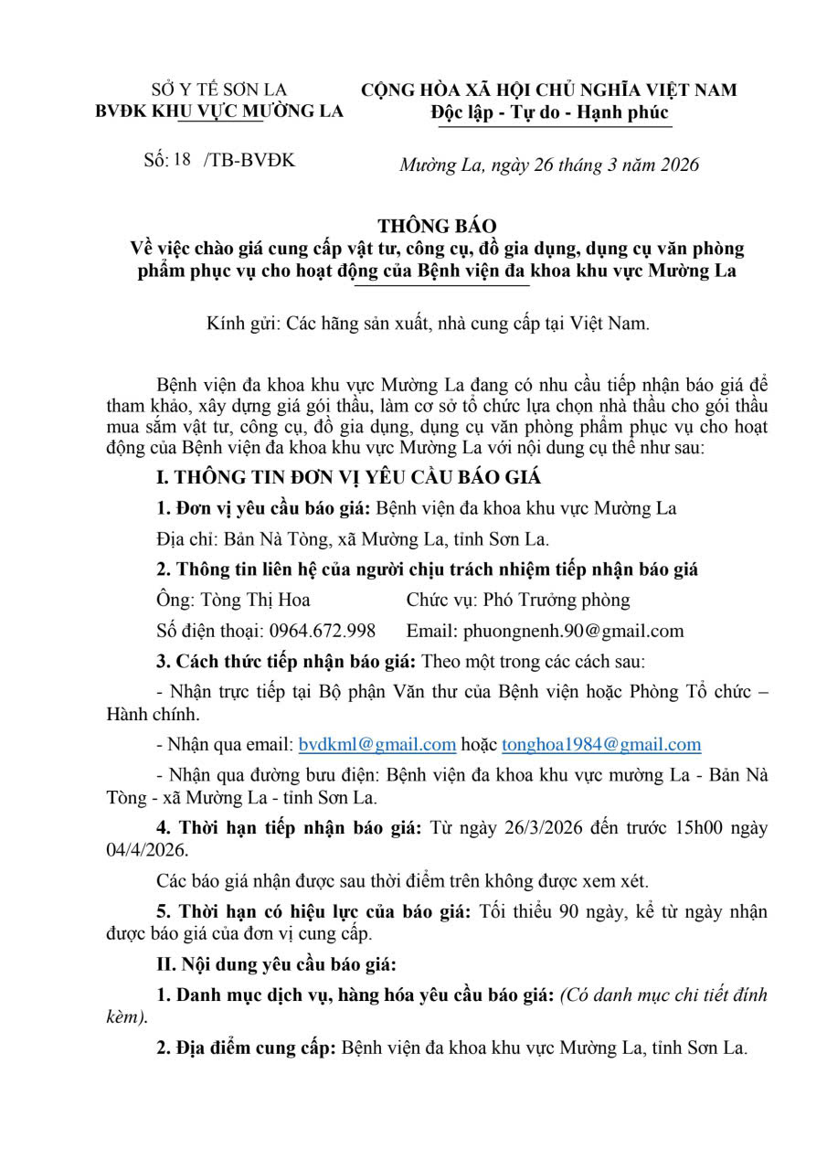 THÔNG BÁO CHÀO GIÁ CUNG CẤP VĂN PHÒNG PHẨM VÀ VẬT TƯ VĂN PHÒNG PHẨM PHỤC VỤ CHO HOẠT ĐỘNG CỦA BỆNH VIỆN ĐA KHOA KHU VỰC MƯỜNG LA