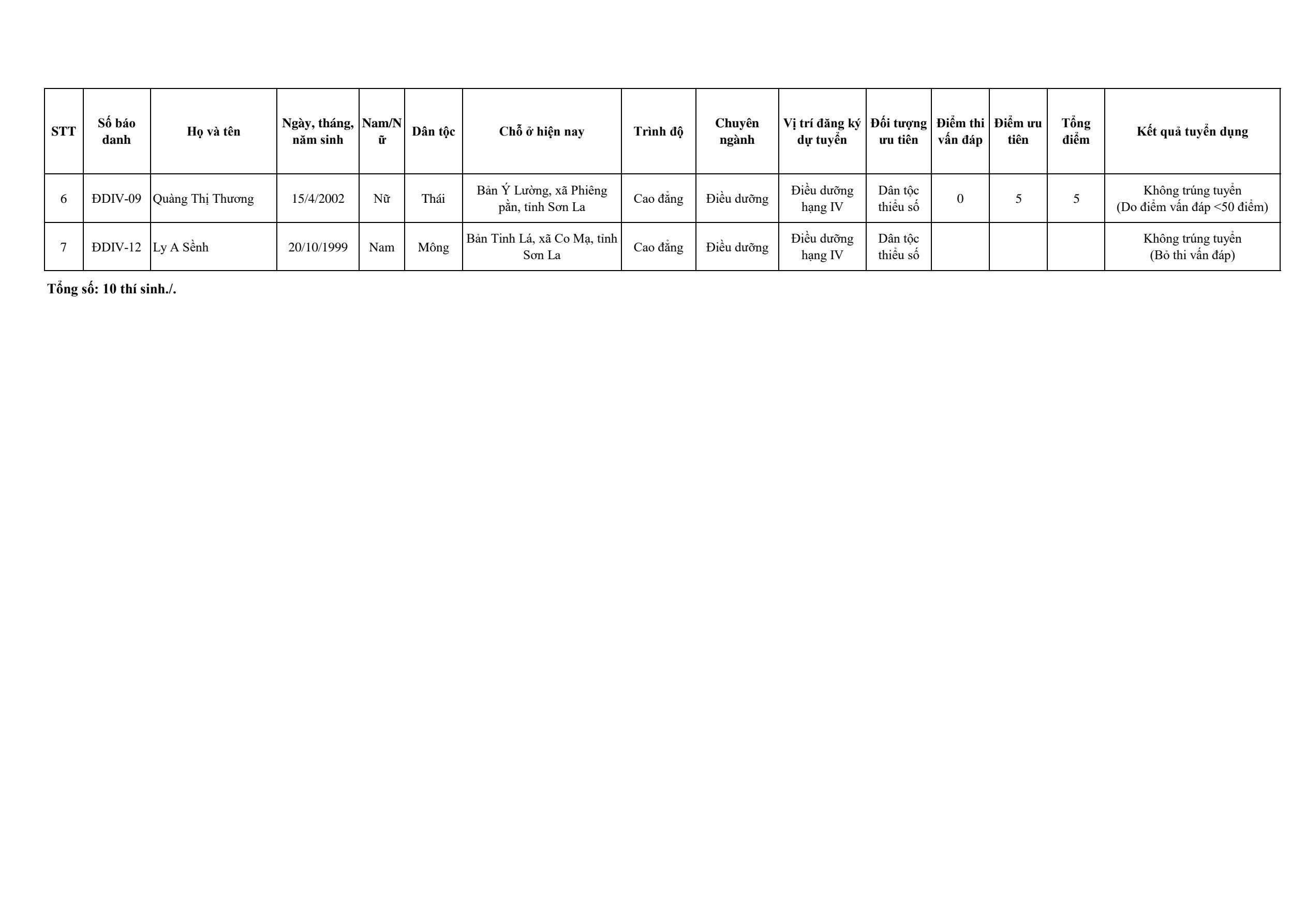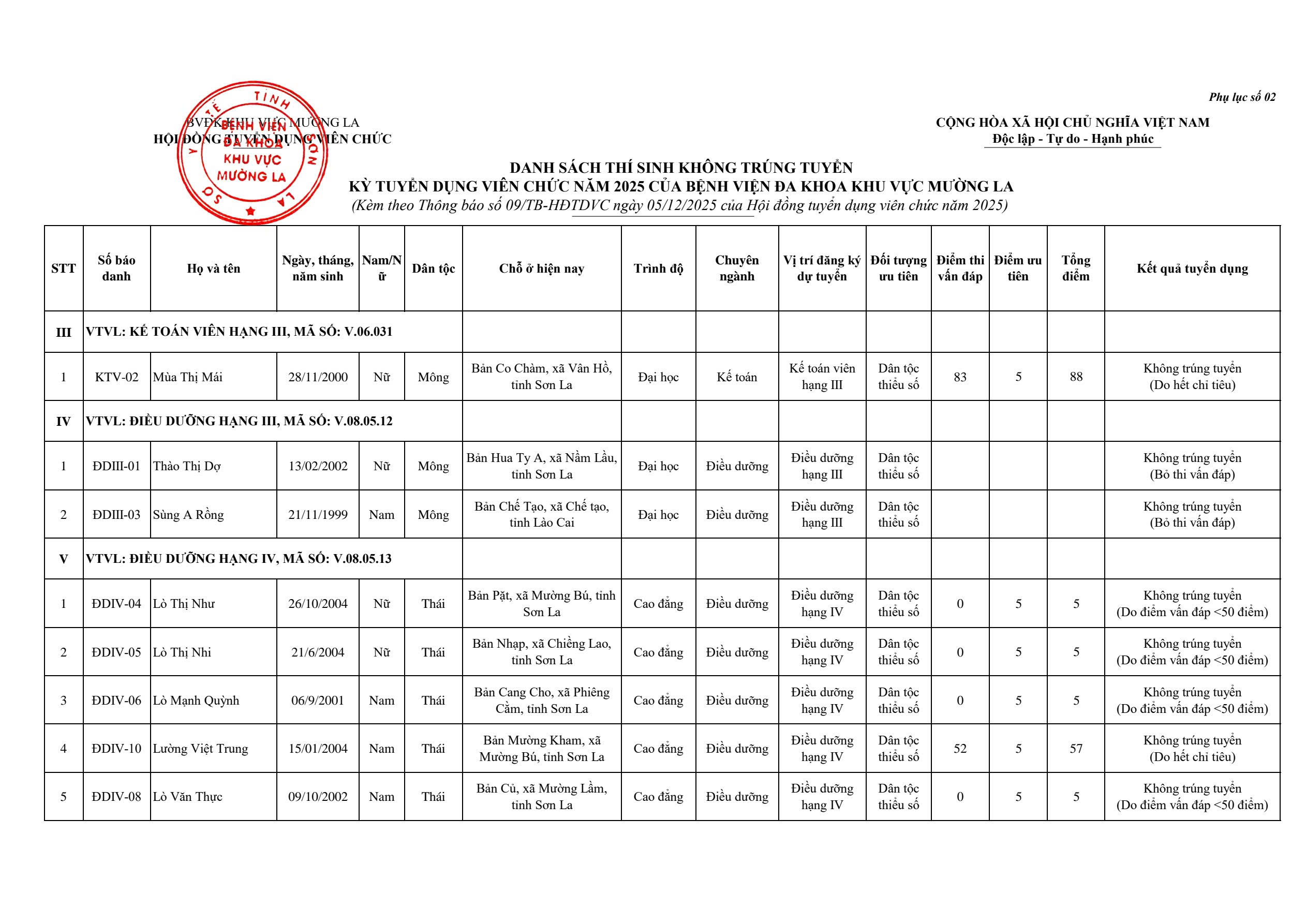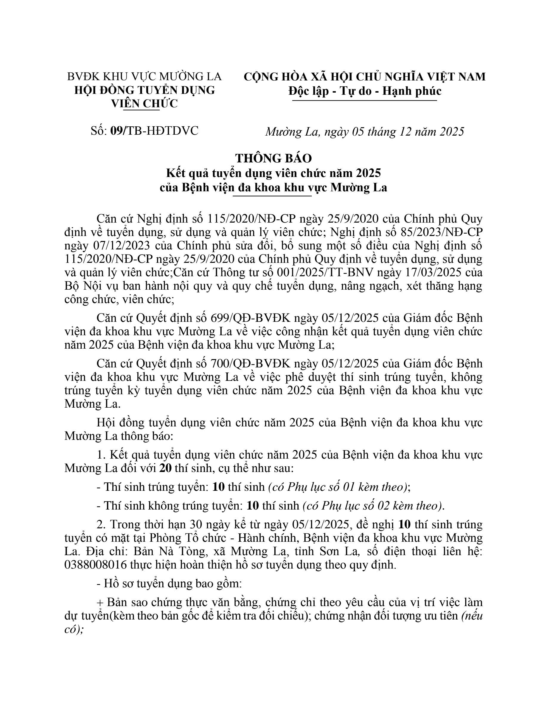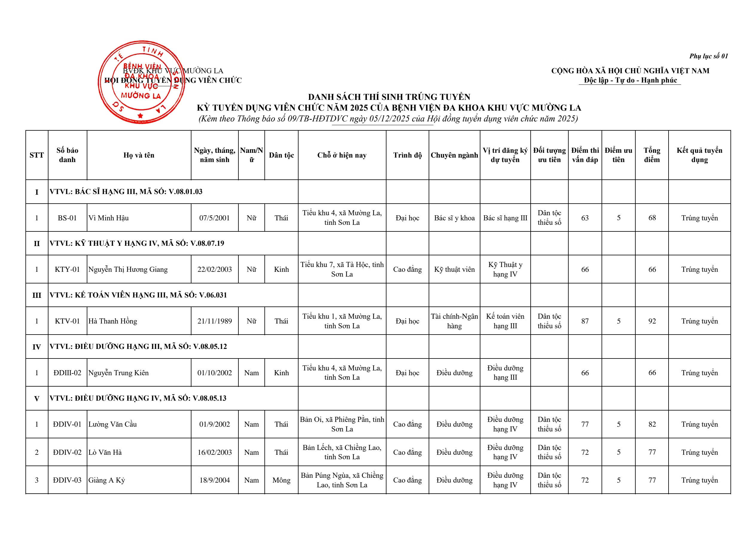 THÔNG BÁO KẾT QUẢ TUYỂN DỤNG VIÊN CHỨC NĂM 2025 CỦA BỆNH VIỆN ĐA KHOA KHU VỰC MƯỜNG LA